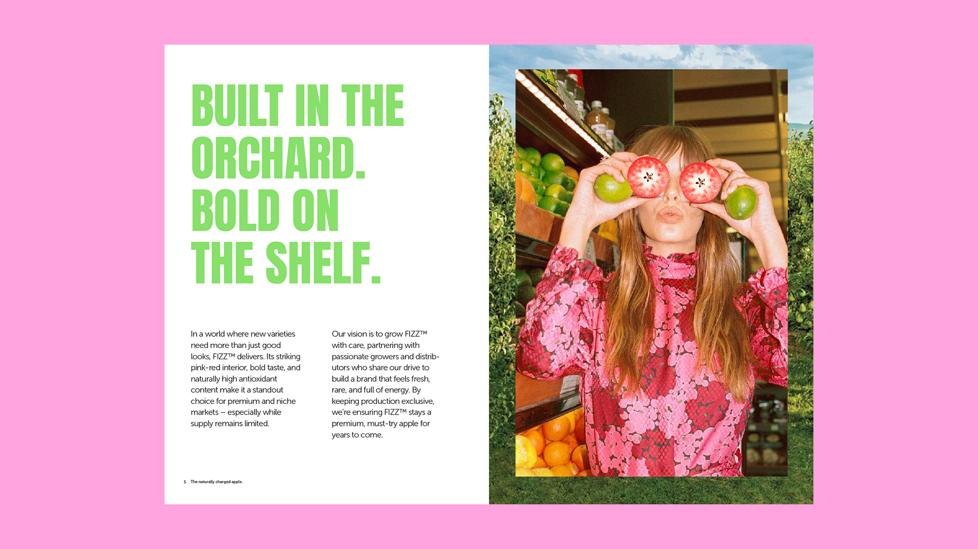 Fizz™ is New Zealand’s first pinky-red flesh apple, known for its antioxidant-rich burst of berry-like flavour. The bold logotype features a hidden lightning bolt between the Z’s, echoing the apple’s fizzy energy. A bright, punchy colour palette enhances the brand’s vibrant, effervescent feel.